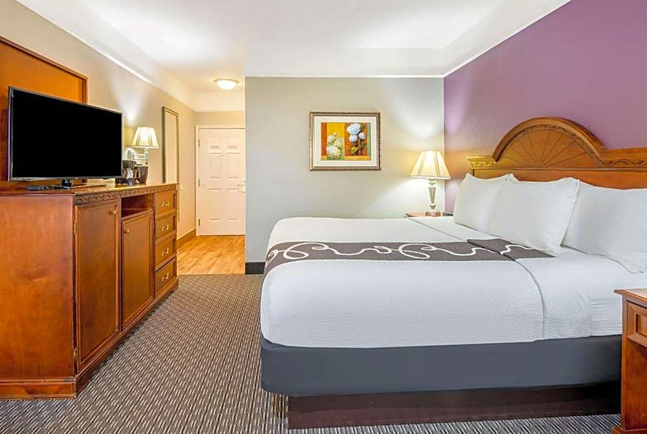A flat-screen TV and work desk are featured in this room. A microwave, refrigerator, and coffee machine are included.